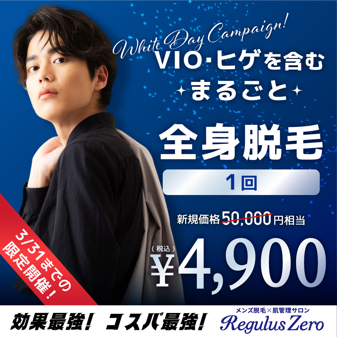 ホワイトデーキャンペーン03 メンズ脱毛×肌管理サロン『REGULUS ZERO」 >> 開催中のキャンペーン >> ホワイトデーキャンペーン03 ホワイトデーキャンペーン03 2026.3.1 キャンペーン 3月限定キャンペーン! レグルスゼロの人気プラン「全身脱毛」が、特別価格で登場。 顔(ヒゲ)・VIO含む全身脱毛1回 4,900円で体験いただけます。 他社では追加料金になることも多い部位も、すべてセット料金に含まれています。 初めての方も、この機会に全身ケアを体感してみませんか? 数量限定につき、ご予約はお早めにどうぞ。 ※本キャンペーンは予告なく変更・終了する場合がございます。 ※初回ご来店の方限定となります。 有効期限 3月31日(火)まで 利用条件 ご新規様のみご利用いただけます。他キャンペーンとの併用はできません。 | 前のページへ|次のページへ